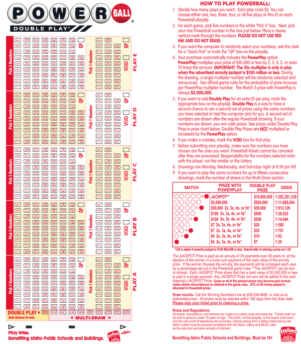 Each play costs $3. Pick five numbers between 1 and 69. Pick one Powerball number between 1 and 26. If you'd like random numbers, ask for a quick pick. Multi-draw tickets can be produced for up to 15 consecutive draws. Drawings are Monday, Wednesday and Saturday. The PowerPlay option is automatically included in every Powerball purchase. PowerPlay for Powerball is a way to multiply your prize of $50,000 or less by 2, 3, 4, 5, or even 10 times. IMPORTANT: The 10 times multiplier is ONLY in play when the advertised annuity jackpot is $150 million or I less. The Match 5 prize with PowerPlay is always $2,000,000. If you match all the numbers you win the jackpot!
