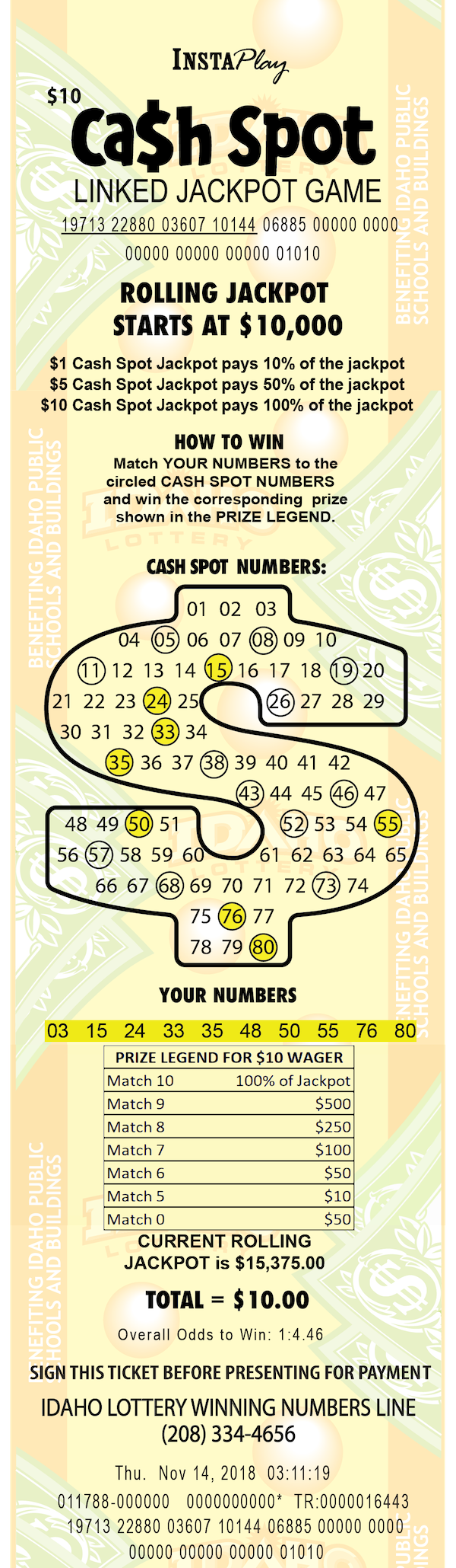 To play, just match your numbers to the circled CASH SPOT NUMBERS and win the corresponding prize shown in the PRIZE LEGEND. If you match 10 circled numbers you win 100% of the jackpot amount for the $10 Cash Spot ticket!!