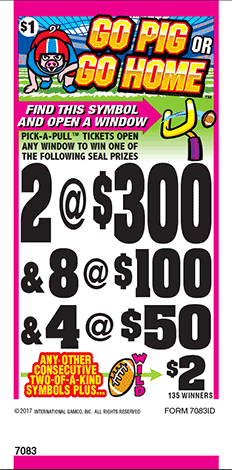 Pull open the tabs to reveal symbols. Get any 3 winning symbols as shown in the prize legend or two-of-a-kind symbols plus a wild and win the prize shown. Win up to $300. All PullTab prizes must be claimed at the location of play on the day of play.