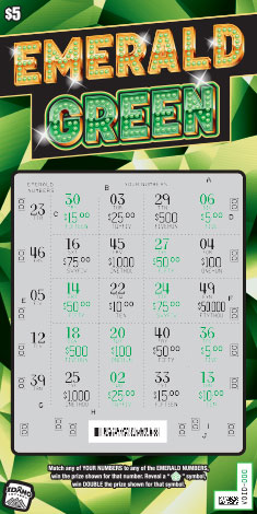 Match any of YOUR NUMBERS to any of the EMERALD NUMBERS, win the prize shown for that number. Reveal a “GREEN EMERALD” symbol, win DOUBLE the prize shown for that symbol.