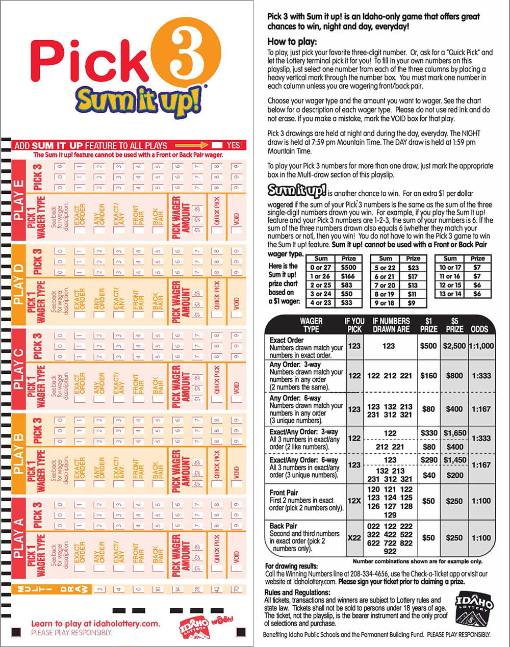 For an extra $1 per dollar wagered, you can add Sum it up! If the sum of your Pick 3 numbers is the same as the sum of the three single-digit numbers drawn, you win. For example, if you play the Sum it up! feature and your Pick 3 numbers are 1-2-3, the sum of your numbers is 6. If the sum of the three numbers drawn also equals 6 (whether they match your numbers or not), then you win!