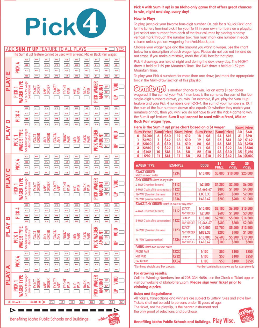 Multi-draw tickets can be produced for up to 70 consecutive draws. Drawings are day and night, every day at 1:59 at 7:59 pm MT. This game is only played in Idaho!